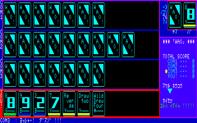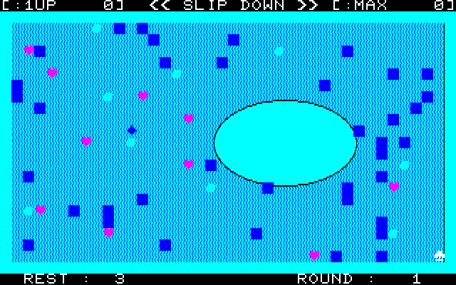 訂正記事があるのとGAME OVER処理でエラーがでますので 勝手に修正します ’84/11訂正記事の760行リスト化け 760 LOCATE 11,22:〜 ’85/02訂正記事のマシン語のリスト抜け Add +0 +1 +2 +3 +4 +5 +6 +7 +8 +9 +A +B +C +D +E +F Sum BB00 00 FF 38 00 FF 00 00 FB 00 00 F5 07 00 5F FE 00 :8A BB10 FF 30 00 FF 00 00 F6 00 00 AB 00 00 D5 01 00 57 :FC BB20 F8 00 FF 00 00 FF 00 00 5E 00 0C A3 01 10 47 81 :DC BB30 00 D7 E0 00 FF 00 00 FD 00 00 5E E0 1C E1 07 10 :05 BB40 47 F8 00 FD E0 00 FF 00 00 D5 00 10 4C C0 35 C0 :01 BB50 07 50 87 FE 00 FF C0 00 FD 00 00 55 01 14 41 80 :C3 BB60 75 80 0F 50 0F FF 00 FF C0 00 FD 00 18 45 00 15 :90 BB70 40 00 F5 00 0F 50 0F FF 00 FF C0 00 FD F8 06 F9 :55 BB80 00 F5 00 00 F5 00 0F 50 0F FF 00 FF E0 00 FD F8 :2B BB90 07 F8 00 F5 00 00 F5 00 0F 50 0F FF 00 FF F0 00 :45 BBA0 FD FE 01 FE 00 F5 00 00 FD 00 0F 50 0F FF 00 FF :58 BBB0 FF 00 FF F8 01 FE 00 F5 00 00 FD 00 03 50 07 FF :40 BBC0 00 FF FF 00 FF C0 00 FF 00 00 FF 00 00 F5 00 00 :B0 BBD0 55 FF 00 FF FC 00 FF 00 00 FF 00 00 FF 00 00 FF :4B BBE0 00 00 D5 3F 00 7F E0 10 EF 00 38 EF 00 3F EA 00 :C2 BBF0 C0 BF 00 7D AA 0F F0 AF 80 7F AA 00 FF AA 00 FF :A5 -------------------------------------------------------- SUM 12 76 76 F0 97 8E 97 F9 A5 4C 18 2C 44 8E A6 2A :7A Add +0 +1 +2 +3 +4 +5 +6 +7 +8 +9 +A +B +C +D +E +F Sum BC00 AA 00 FF AA 00 FF AA 03 FC AB 00 FF AA 00 FF AA :F8 BC10 00 FF AA 00 FF AA 00 FF AA 00 FF AA 00 FF AA 00 :4D BC20 FF AA 00 FF AA 00 FF AA 00 FF AA 00 FF AA 14 06 :67 BC30 FF 00 FF E1 00 FF 80 00 FF 3F 00 FF FF 00 FF FF :98 BC40 00 FF FE 00 FF 00 00 FF 00 00 FF 00 00 FF FF 00 :F8 BC50 FF FF 00 FF F8 00 FF 00 00 FF 00 00 FF 00 00 FF :F1 BC60 0F 00 FF FF 00 FF F0 00 FF 00 00 F7 00 00 FD 00 :EF BC70 00 55 03 00 7F FF 00 FF C0 00 FF 00 00 D5 00 00 :69 BC80 75 00 00 55 00 00 57 FF 00 FF 80 00 FD 00 07 50 :F3 BC90 00 00 F4 1F 80 1F 80 00 D7 FF 00 FF 00 00 FD 3C :40 BCA0 02 7D 00 00 F5 0F A0 0F E0 00 F7 FF 00 FF 00 00 :07 BCB0 F5 7C 02 7D 00 00 F5 0F A0 0F F3 00 F7 FF 00 FF :8B BCC0 00 00 D5 FE 01 FE 00 00 F4 07 A8 07 FF 00 FF FF :79 BCD0 00 FF 01 00 D5 FE 01 FE 00 E6 10 03 A8 03 FF 00 :75 BCE0 FF FF 00 FF 03 00 D7 FE 01 FE 00 FF 00 03 A8 03 :81 BCF0 FF 00 FF FF 00 FF 0F 00 DF FE 01 FE 00 FF 00 01 :E7 -------------------------------------------------------- SUM 20 F3 73 75 6D CF 6B C3 8F DE CA A4 42 80 62 3C :A0 Add +0 +1 +2 +3 +4 +5 +6 +7 +8 +9 +A +B +C +D +E +F Sum BD00 AA 01 FF 00 FF FF 00 FF 9F 00 DF FE 01 FE 00 FF :21 BD10 00 01 AA 01 FF 00 FF FF 00 FF FF 00 FF FE 01 FE :A3 BD20 00 FF 00 01 AA 01 FF 00 FF FF 00 FF FF 00 FF C0 :65 BD30 00 FF 00 00 FE 00 00 AA 03 00 AB FF 00 FF F0 00 :43 BD40 FF 00 00 FF 00 00 FF 00 00 FA 00 00 AA 0F 00 AF :5F BD50 C0 00 FF 00 1F EA 00 80 FF 00 F0 AF 00 1E EA 03 :F1 BD60 00 AB C0 03 FE 00 FF AA 00 FF AA 00 FF AA 00 FF :66 BD70 AA 03 F4 AB 00 FF AA 00 FF AA 00 FF AA 00 FF AA :F0 BD80 00 FF AA 00 FF AA 00 FF AA 00 FF AA 00 FF AA 00 :4D BD90 FF AA 00 FF AA 00 FF AA 0C 06 FF 03 FF FF F8 FF :04 BDA0 FF FF FF FF 80 FF FF 07 FF FF FC FF FF 0F FF FF :86 BDB0 FF FF FF FF FF FF F8 FF FF 1F FF FF FE FF FF 3F :48 BDC0 FF FF FF FF FF FF FF FF FF FF FF FF FF FF FF FF :F0 BDD0 FF 3F FF FF FF FF FF FF FF FF FF FF FF FF FF FF :30 BDE0 FF FF FF 1F FF FF FF FF FF FF FF FF FF FF FF FF :10 BDF0 FF FE FE FE FF 3F FF FF FF FF FF FF FF FF FF FF :2D -------------------------------------------------------- SUM 0C 90 FF C7 E7 CD 98 7D 4F C1 18 51 4A DA 75 51 :8E Add +0 +1 +2 +3 +4 +5 +6 +7 +8 +9 +A +B +C +D +E +F Sum BE00 FF FF FF EA EA EA FF FF FF FF FF FF FE FE FE FF :AE BE10 FF FF FF FF FF EA EA EA BF BF BF FF FF FF EA EA :C7 BE20 EA BF BF BF FF FF FF EB E8 EB AB AB AB FE FE FE :DD BE30 AA AA AA AF AF AF FF FF FF AF A0 AF EA 2A EA AA :AE BE40 AA AA AA AA AA AA AA AA AF AF AF AF A0 AF FA 0A :5F BE50 FA AA AA AA FF 80 FF FA 0A FA AA AA AA BF A0 BF :90 BE60 FA 02 FA AB A8 AB FF 00 FF FF 00 FF AA AA AA BF :AD BE70 80 BF 0E 00 2B E5 36 4B 2B 2B 2B 36 01 E1 C9 CD :0D BE80 FC 56 CD BD 40 57 3E 03 3C 5F 00 15 C8 7E 23 D6 :A3 BE90 31 FE 09 38 F3 D6 10 E6 DF FE 1A D2 06 0B E5 D5 :C3 BEA0 21 C5 BE 87 4F 06 00 09 4E 23 56 F3 3A C1 E6 EE :12 BEB0 20 D3 40 32 C1 E6 FB 41 10 FE 15 20 EE 1D 20 EA :A0 BEC0 D1 E1 C3 8B BE F8 2E EA 32 DD 34 D0 38 C4 3A B8 :CF BED0 3E AE 42 A4 46 9A 4A 91 4E 88 54 80 58 79 5E 72 :D8 BEE0 64 6B 6A 65 70 5F 76 59 7E 53 86 4E 8E 4A 94 45 :92 BEF0 9E 41 A8 3D B2 39 BC 36 C6 E9 4B 4F 4E 4F 4D 41 :15 -------------------------------------------------------- SUM 2F A3 AE D5 7C 7F B8 FF C5 4A 6B CD E9 5B 64 19 :0F Add +0 +1 +2 +3 +4 +5 +6 +7 +8 +9 +A +B +C +D +E +F Sum BF00 27 67 00 F5 C5 00 E5 11 00 DC 1A BC 28 07 00 00 :1F BF10 E1 C1 F1 D9 C9 C6 04 27 12 EB 23 34 23 34 34 01 :06 BF20 30 BF CD 59 A0 EB 18 E7 48 49 4E 4F 48 49 44 45 :E7 BF30 08 02 73 70 03 FE 00 FE 7B 78 03 FF 00 FF 00 7F :5F BF40 7F 00 FF FF 00 7F 7F 00 FF FF 00 7F 00 00 FF 00 :F7 BF50 00 7F 7F 00 FF FF 7F 7F 7F FF FF FF 7F 7F 7F FE :F1 BF60 FE FE 08 02 FF 55 00 FF 55 00 FF 55 00 FF 55 00 :56 BF70 FF 55 00 FF 55 00 FF 55 00 FF 55 00 FF 55 00 FF :A3 BF80 55 00 FF 55 00 FF 55 00 FF 55 00 FF 55 00 FF 55 :F9 BF90 00 FF 55 00 21 01 DC 56 23 01 30 BF 34 34 CD 59 :49 BFA0 A0 15 20 F8 C9 00 41 2C 55 43 48 49 59 41 4D 41 :54 -------------------------------------------------------- SUM B1 CF 2B E4 6E 82 70 72 1F 1E 59 18 F3 CB 64 B1 :E2 780行の’が抜けているので追加か:以降削除 780 *OVER:’…GAME OVER!!! 9面1周クリア確認済み I/O ’83/12:ICG/PLUSII PC−8801用 一応OK